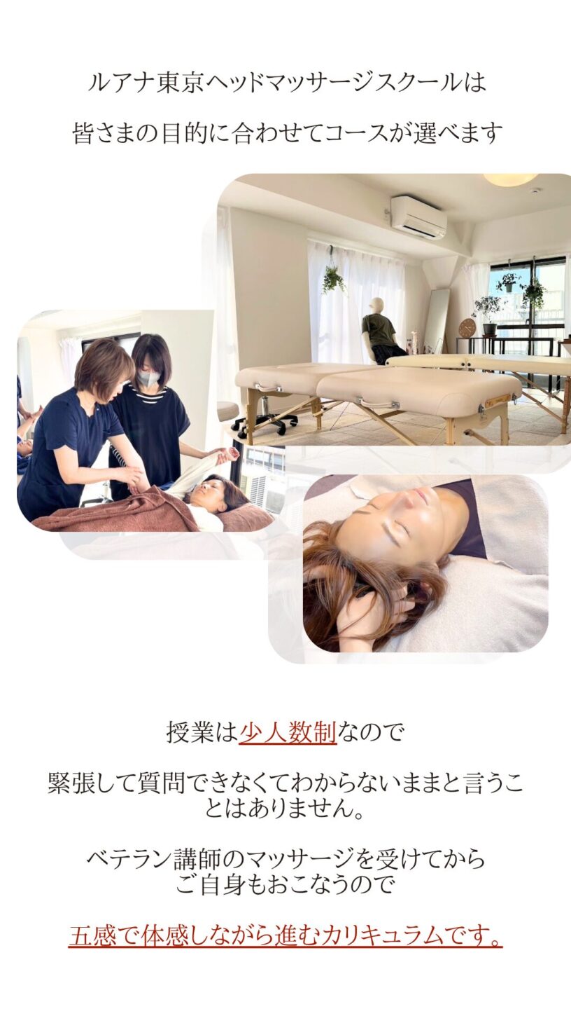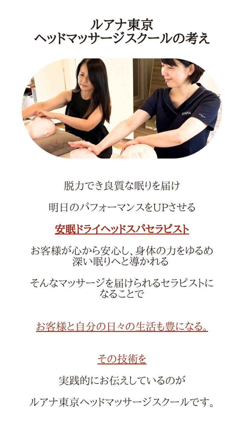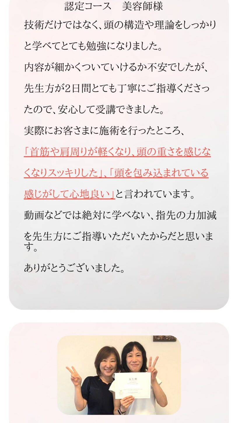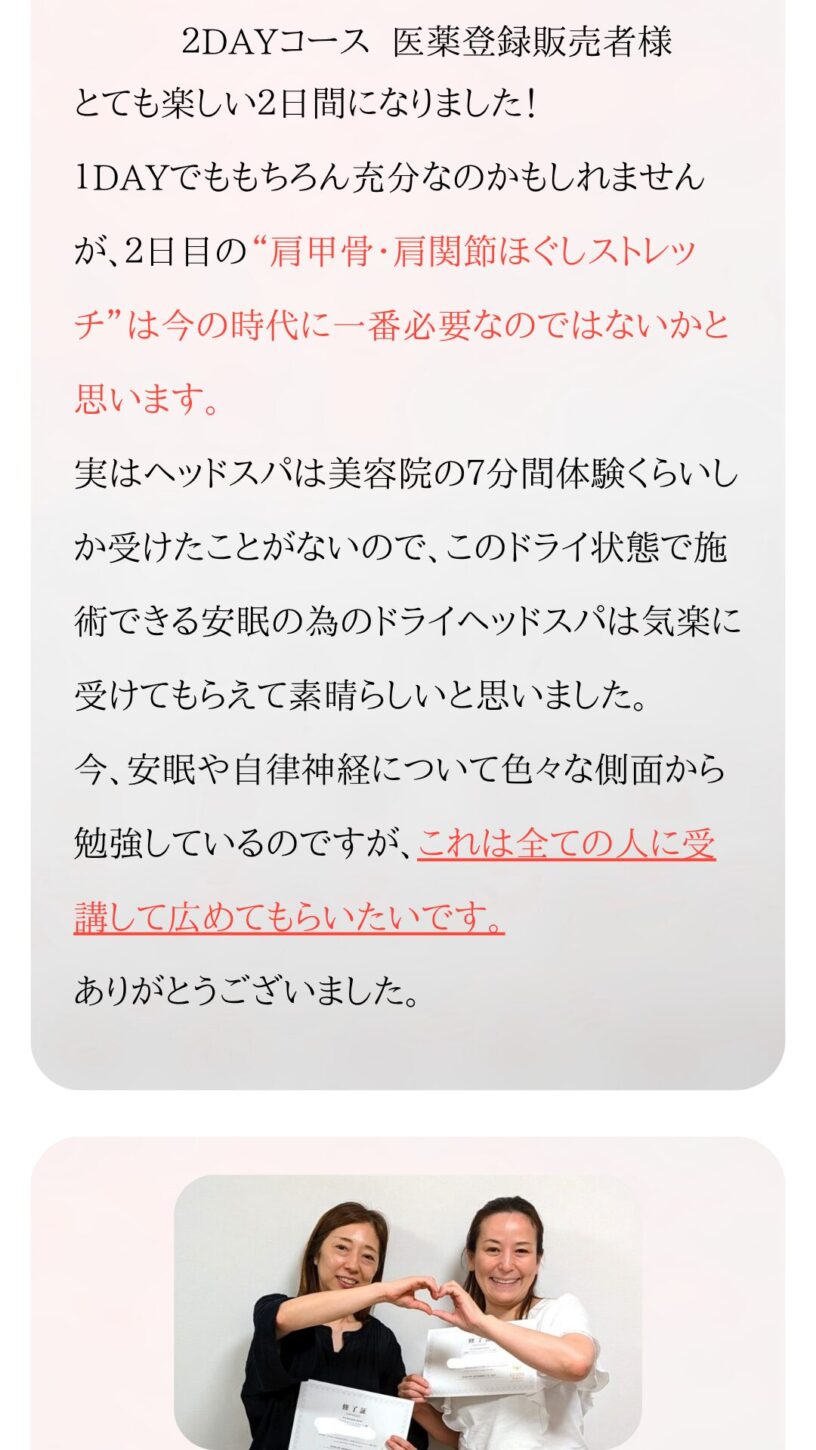 に投稿されました わたなべひろみTrustindex は、レビューの元のソースが Google であることを確認します。 講師の先生が優しく、楽しく受講する事ができました。 セラピストの仕事は手技だけでなく、先生のように癒しを与えられるようなお人柄も大切だと感じました。 私も癒しを求める人達を、優しく癒せるセラピストを目指します。 ありがとうございました。に投稿されました megumi yokoiTrustindex は、レビューの元のソースが Google であることを確認します。 参加者も少人数で、密にわかりやすく教えてくださり、お値段以上の学びのお時間でした!ありがとうございました!に投稿されました miyuTrustindex は、レビューの元のソースが Google であることを確認します。 安眠ドライヘッドスパ講座2daysを受けました。わかりやすくて丁寧な指導で先生の施術を体験しながら学べるので初めてでしたが実践にスムーズに入れました。ちゃんと出来ているか瞬時に察してくれながら手取り足取り手技をわかりやすく指導してくれました。質問もしやすく確認した所も府に落ちるよう一生懸命応えてくれてありがたかったです。先生の技術や指導力の高さはもちろんですが何よりお人柄に惹かれました。 こちらに決めて本当に良かったと思ってます。次回デコルテマッサージ講座も予約しました。 また学びに行きたいと思わせるスクールです。に投稿されました Ni CoTrustindex は、レビューの元のソースが Google であることを確認します。 安眠ドライヘッドスパ講座2days受講しました。初回の講座から認定試験までだいぶ時間が空き、自信がなかったのですが、丁寧に何度も教えていただき合格することができました! 講師の先生方はフレンドリーで、何度質問しても丁寧に教えて下さいます。 自宅で学習できるように動画も視聴でき、テキストを見返して復習できるのも安心ポイントでした。 他にも興味のある講座があるので、またお願いしたいと思います。 ありがとうございました!に投稿されました ArukkaTrustindex は、レビューの元のソースが Google であることを確認します。 安眠ヘッドマッサージ基礎コースを受講しました。短時間で習得出来るコースでしたが、内容は本格的で、施術の姿勢から圧のかけ方まで、とてもわかりやすくて丁寧に教えて頂けます。実際に先生を相手に施術の練習もするので、修正箇所も的確で自分自身取り込みやすかったです! また、復習用の動画もあるので、何度も見返して練習も出来てありがたいです。 基礎フェイシャルコースに続けての受講でしたが、他にもたくさんの講座があるようなので、また学びたい事があったら利用させて頂きます! 少人数でじっくり学びない方にはぜひオススメしたいです♪に投稿されました M MTrustindex は、レビューの元のソースが Google であることを確認します。 安眠ドライヘッドスパ基礎講座を受講しました。少人数制で、今回はマンツーマンでご指導いただけました。分からなかったり不安なところもじっくり聞いて解消できました。 部位によっても指の使い方が異なり、マッサージの奥深さを知ることができました…! 今までは感覚と独学で何となくやっていたマッサージでしたが、今日学んだ基礎のやり方を家族や身近な方々に実践して、体得したいと思います‼︎に投稿されました 志村優子Trustindex は、レビューの元のソースが Google であることを確認します。 安眠ヘッド2Day受講しました。部屋の雰囲気がとても良くリラックス。先生がゆっくり丁寧に教えてくださったので、とても楽しく進める事ができました。 動画も頂いたので後から見返しで勉強できるところが素晴らしいと思います!に投稿されました 樋田サヤカTrustindex は、レビューの元のソースが Google であることを確認します。 ドライヘッド、力加減など教えて頂かないと分からないので、しっかり丁寧に教えて頂けて良かったです!ありがとうございました!に投稿されました 時栄高橋Trustindex は、レビューの元のソースが Google であることを確認します。 安眠ドライヘッドスパ基礎講座から2day講座まで3日間で受講しました。全く初めてのことだったのでどうしても基礎講座から受講したかったのと、仕事の都合で平日で受講したい事(遠方から行くため連続で受講したかった)を申込み前に相談問い合わせしたところ、すぐに対応してくださいました。少人数制とあったのでそこもこちらのスクールに決めた理由でしたが、教えていただいた先生方はとても明るくフレンドリーでとても丁寧に教えていただき、講座の内容だけでなくこの先生方に出会えて教えていただき、こちらのスクールで学べて本当に良かったと思えるとても充実した3日間でした。 ありがとうございました!に投稿されました EMITrustindex は、レビューの元のソースが Google であることを確認します。 2daysドライヘッドスパ コースを受講しました。先生方が、みなさんとても優しく、丁寧にわかりやすく教えてくれました! そして場所も駅