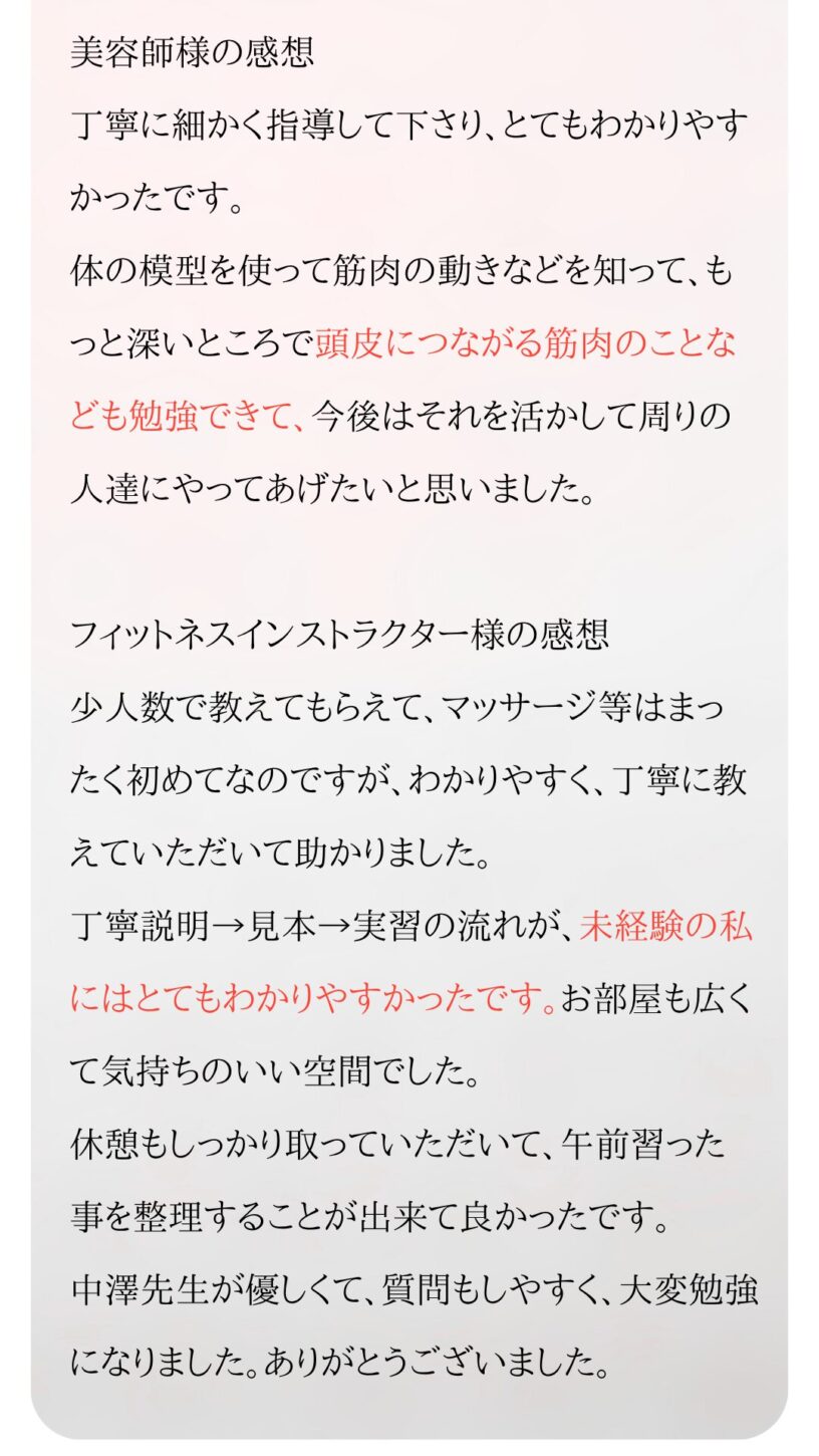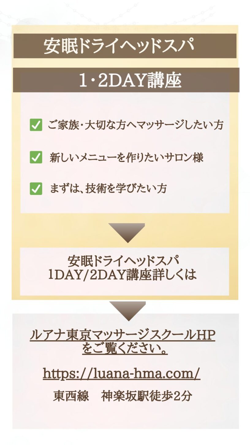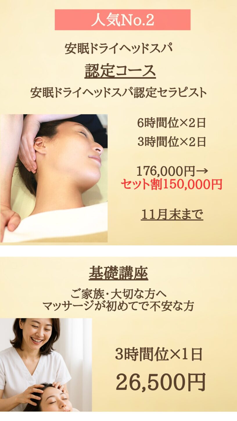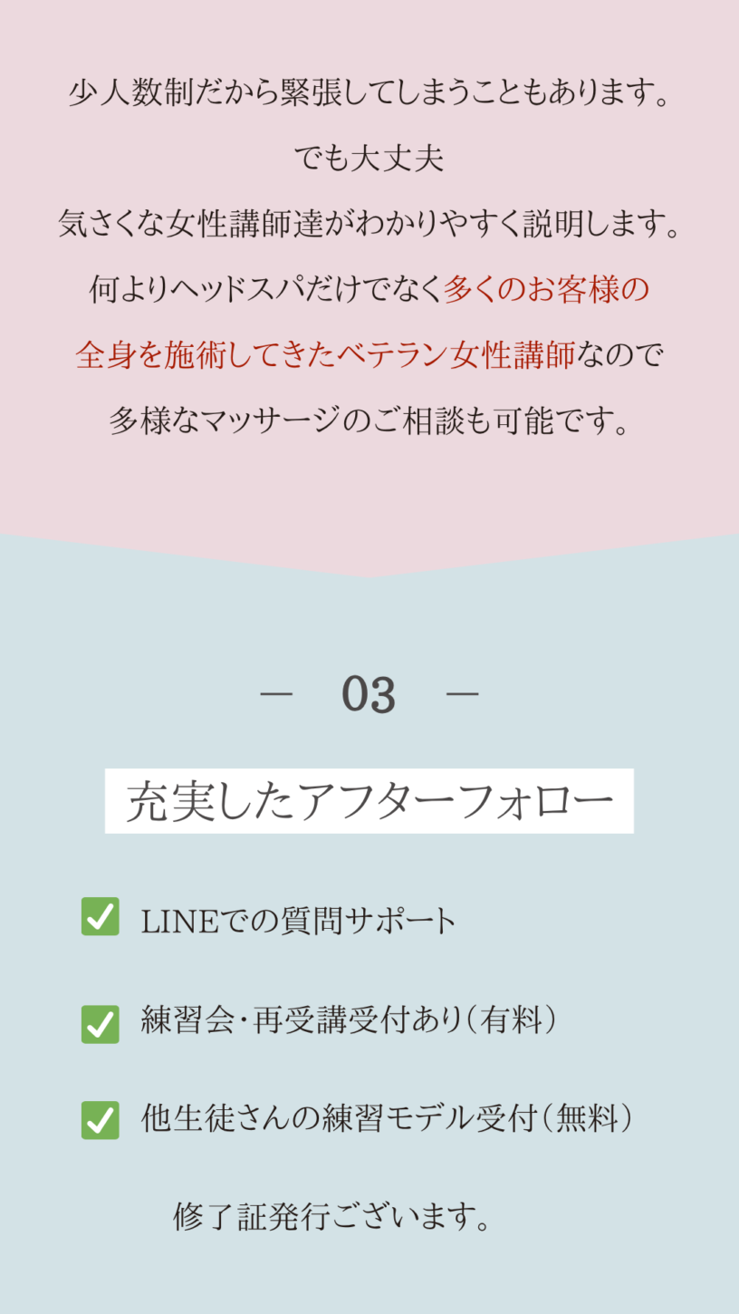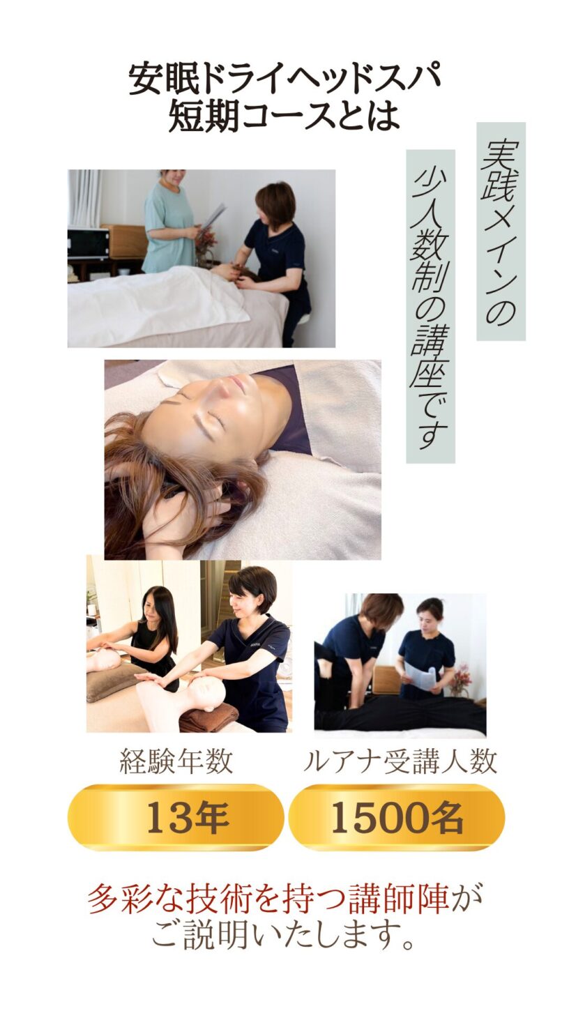 に投稿されました わたなべひろみTrustindex は、レビューの元のソースが Google であることを確認します。 講師の先生が優しく、楽しく受講する事ができました。 セラピストの仕事は手技だけでなく、先生のように癒しを与えられるようなお人柄も大切だと感じました。 私も癒しを求める人達を、優しく癒せるセラピストを目指します。 ありがとうございました。に投稿されました megumi yokoiTrustindex は、レビューの元のソースが Google であることを確認します。 参加者も少人数で、密にわかりやすく教えてくださり、お値段以上の学びのお時間でした!ありがとうございました!に投稿されました miyuTrustindex は、レビューの元のソースが Google であることを確認します。 安眠ドライヘッドスパ講座2daysを受けました。わかりやすくて丁寧な指導で先生の施術を体験しながら学べるので初めてでしたが実践にスムーズに入れました。ちゃんと出来ているか瞬時に察してくれながら手取り足取り手技をわかりやすく指導してくれました。質問もしやすく確認した所も府に落ちるよう一生懸命応えてくれてありがたかったです。先生の技術や指導力の高さはもちろんですが何よりお人柄に惹かれました。 こちらに決めて本当に良かったと思ってます。次回デコルテマッサージ講座も予約しました。 また学びに行きたいと思わせるスクールです。に投稿されました Ni CoTrustindex は、レビューの元のソースが Google であることを確認します。 安眠ドライヘッドスパ講座2days受講しました。初回の講座から認定試験までだいぶ時間が空き、自信がなかったのですが、丁寧に何度も教えていただき合格することができました! 講師の先生方はフレンドリーで、何度質問しても丁寧に教えて下さいます。 自宅で学習できるように動画も視聴でき、テキストを見返して復習できるのも安心ポイントでした。 他にも興味のある講座があるので、またお願いしたいと思います。 ありがとうございました!に投稿されました ArukkaTrustindex は、レビューの元のソースが Google であることを確認します。 安眠ヘッドマッサージ基礎コースを受講しました。短時間で習得出来るコースでしたが、内容は本格的で、施術の姿勢から圧のかけ方まで、とてもわかりやすくて丁寧に教えて頂けます。実際に先生を相手に施術の練習もするので、修正箇所も的確で自分自身取り込みやすかったです! また、復習用の動画もあるので、何度も見返して練習も出来てありがたいです。 基礎フェイシャルコースに続けての受講でしたが、他にもたくさんの講座があるようなので、また学びたい事があったら利用させて頂きます! 少人数でじっくり学びない方にはぜひオススメしたいです♪に投稿されました M MTrustindex は、レビューの元のソースが Google であることを確認します。 安眠ドライヘッドスパ基礎講座を受講しました。少人数制で、今回はマンツーマンでご指導いただけました。分からなかったり不安なところもじっくり聞いて解消できました。 部位によっても指の使い方が異なり、マッサージの奥深さを知ることができました…! 今までは感覚と独学で何となくやっていたマッサージでしたが、今日学んだ基礎のやり方を家族や身近な方々に実践して、体得したいと思います‼︎に投稿されました 志村優子Trustindex は、レビューの元のソースが Google であることを確認します。 安眠ヘッド2Day受講しました。部屋の雰囲気がとても良くリラックス。先生がゆっくり丁寧に教えてくださったので、とても楽しく進める事ができました。 動画も頂いたので後から見返しで勉強できるところが素晴らしいと思います!に投稿されました 樋田サヤカTrustindex は、レビューの元のソースが Google であることを確認します。 ドライヘッド、力加減など教えて頂かないと分からないので、しっかり丁寧に教えて頂けて良かったです!ありがとうございました!に投稿されました 時栄高橋Trustindex は、レビューの元のソースが Google であることを確認します。 安眠ドライヘッドスパ基礎講座から2day講座まで3日間で受講しました。全く初めてのことだったのでどうしても基礎講座から受講したかったのと、仕事の都合で平日で受講したい事(遠方から行くため連続で受講したかった)を申込み前に相談問い合わせしたところ、すぐに対応してくださいました。少人数制とあったのでそこもこちらのスクールに決めた理由でしたが、教えていただいた先生方はとても明るくフレンドリーでとても丁寧に教えていただき、講座の内容だけでなくこの先生方に出会えて教えていただき、こちらのスクールで学べて本当に良かったと思えるとても充実した3日間でした。 ありがとうございました!に投稿されました EMITrustindex は、レビューの元のソースが Google であることを確認します。 2daysドライヘッドスパ コースを受講しました。先生方が、みなさんとても優しく、丁寧にわかりやすく教えてくれました! そして場所も駅