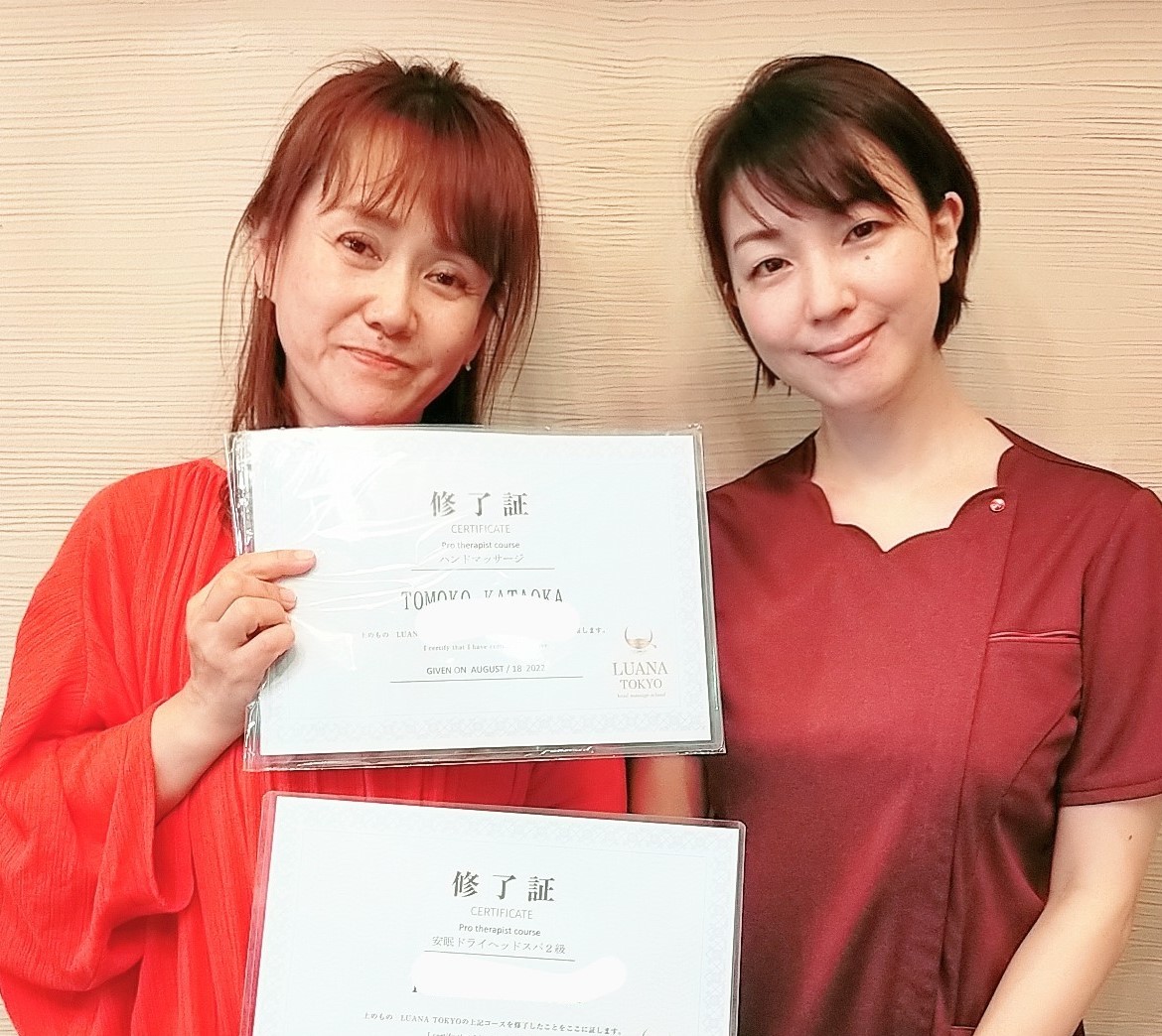 先生お二方とも、とっても話しやすく初め緊張していましたが、リラックスして受ける事が出来ました。これから自分のサロンを持ちたいと思って今回受けました。