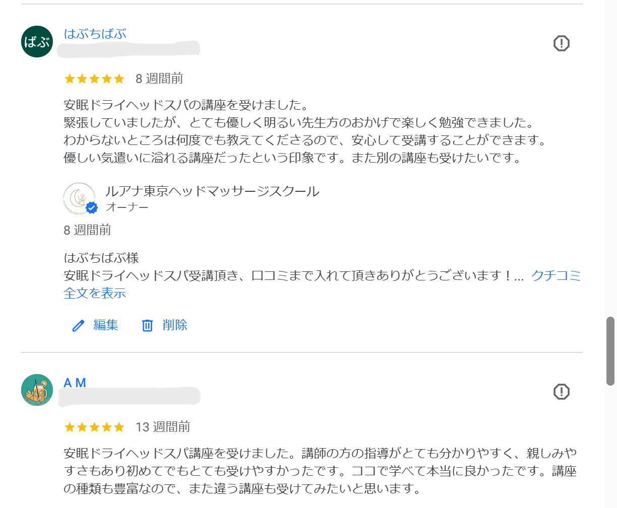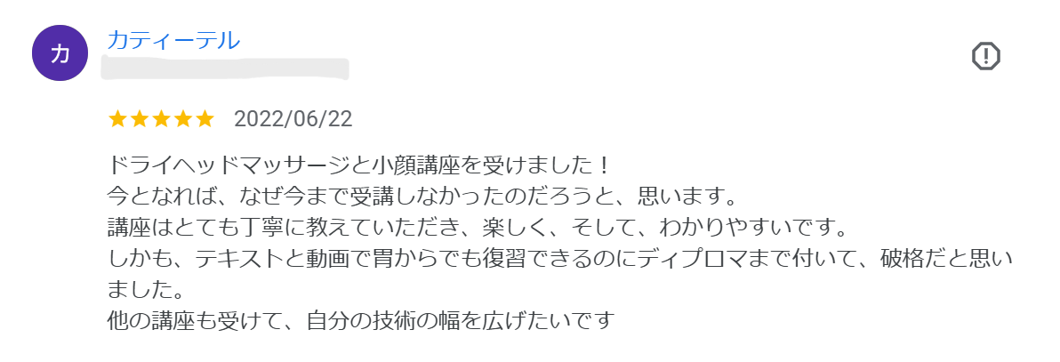 安眠ドライヘッドスパの感想 沢山あるスクールの中からルアナ東京を選んで良かったです! ルアナ東京ヘッドマッサージスクールにご来校頂き、Google口コミ投稿もありがとうございます。 分からないこともいつでも答えて頂けるフォローもありが... お客様の反応が良くルアナ東京で習って良かった。